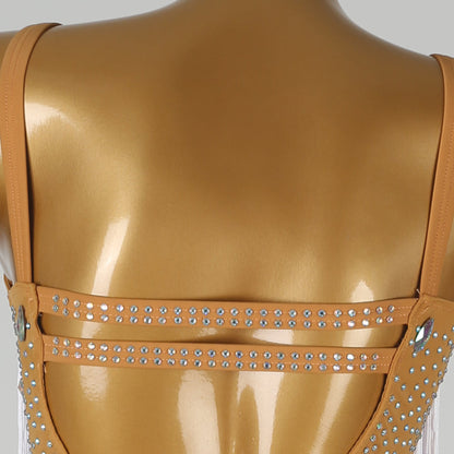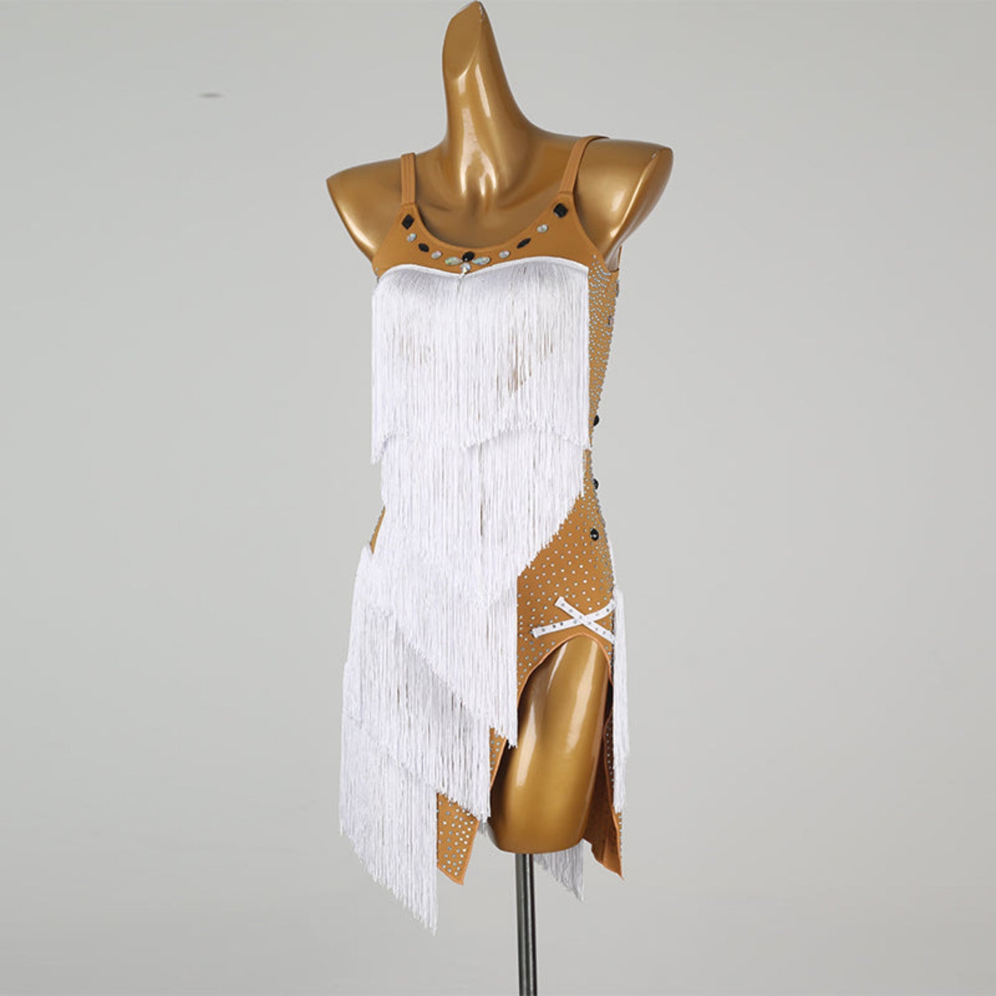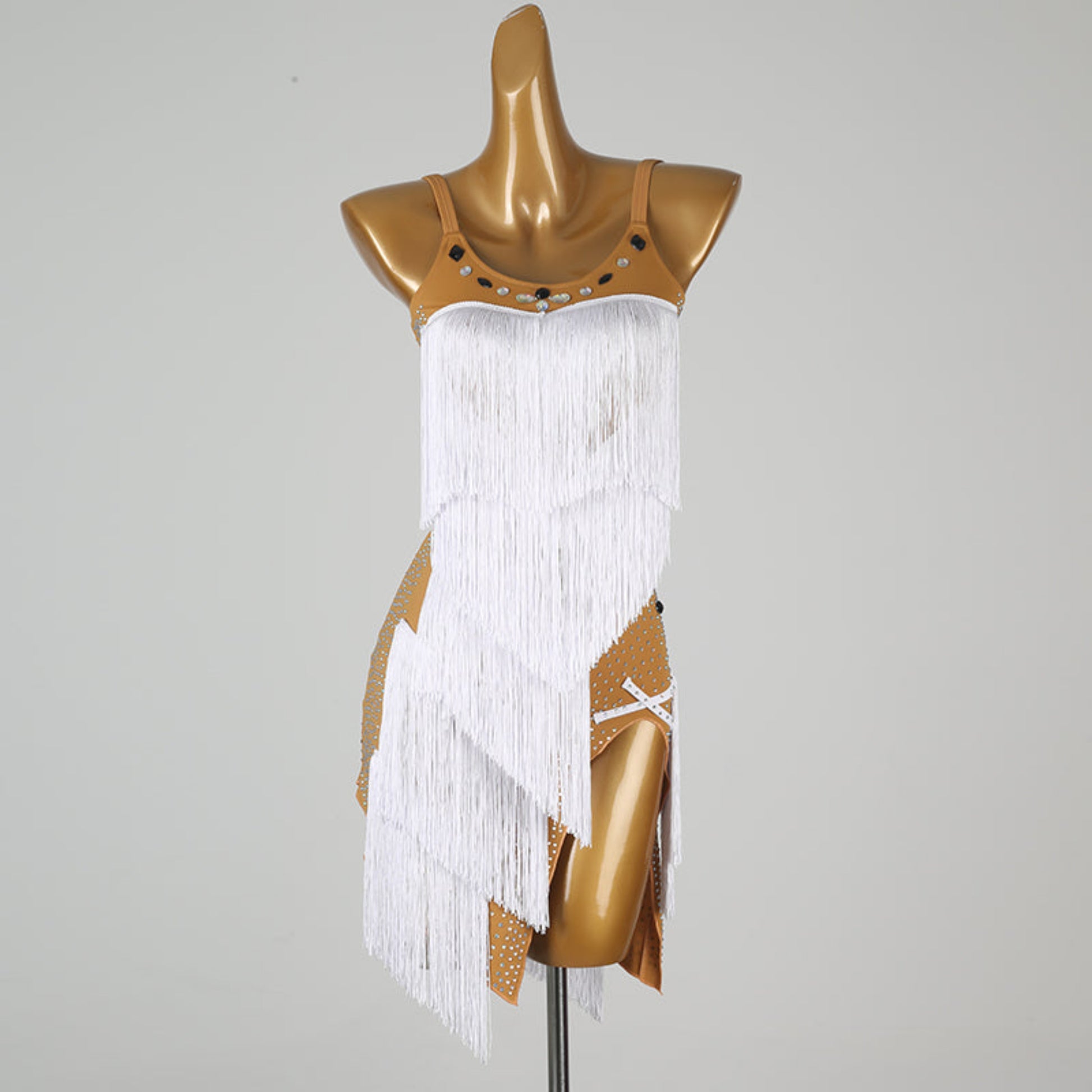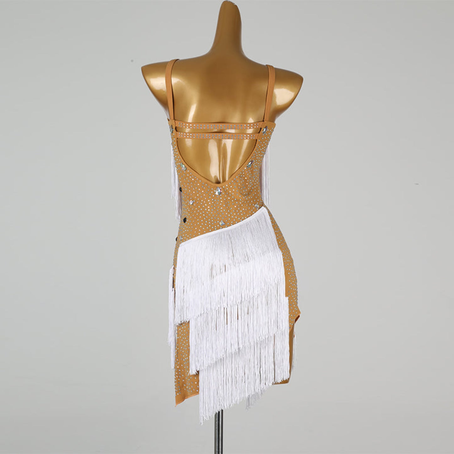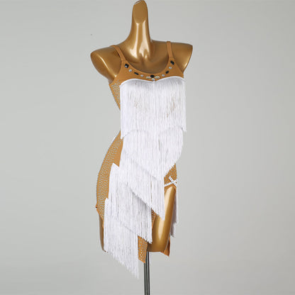 Glow in this exclusive white fringe dress adorned with dazzling stones. Featuring open arms and a bold bare back, it offers fluid motion, shimmering elegance, and captivating charm with every move.