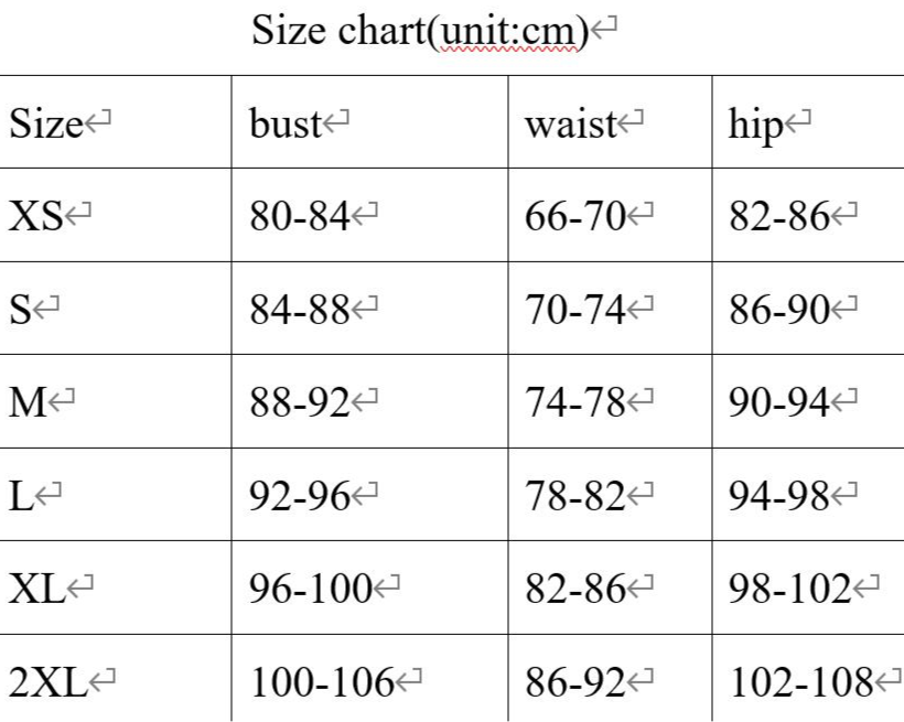 | 2XL | 100-106 | 86-92 | 102-108 |