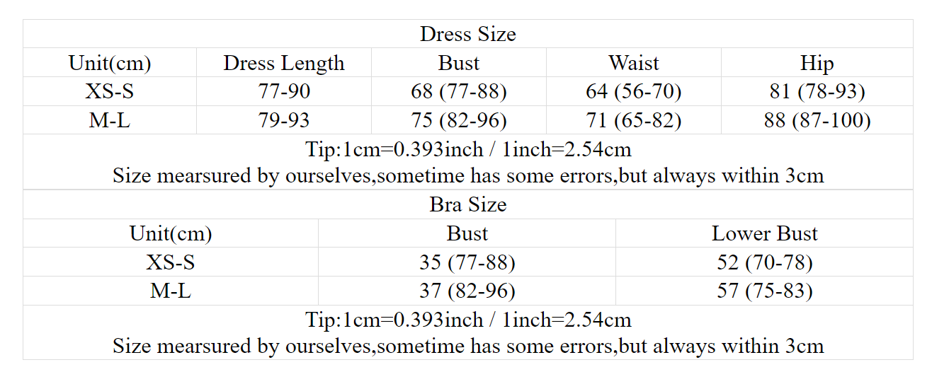 | Size chart for dress (unit: cm) | ||||