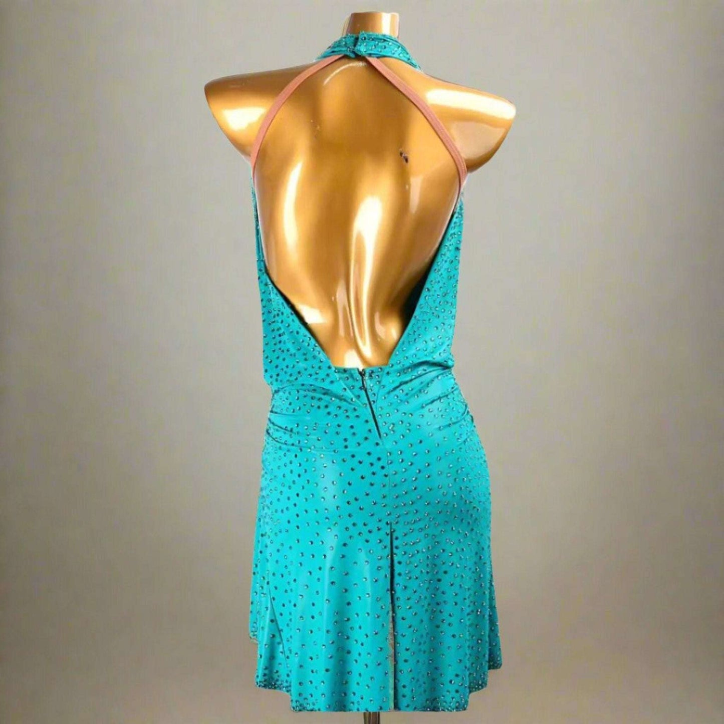 Elevate your dancing attire with our customizable sleeveless turquoise dress, adorned with a magnificent open back and intricately placed gemstones. This captivating gown is tailored for dynamic performances, merging vivid hues and dazzling gems to leave a lasting impression on the dance floor. Ideal for latin dancers who desire elegance and refinement.