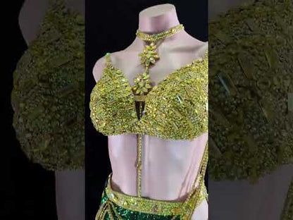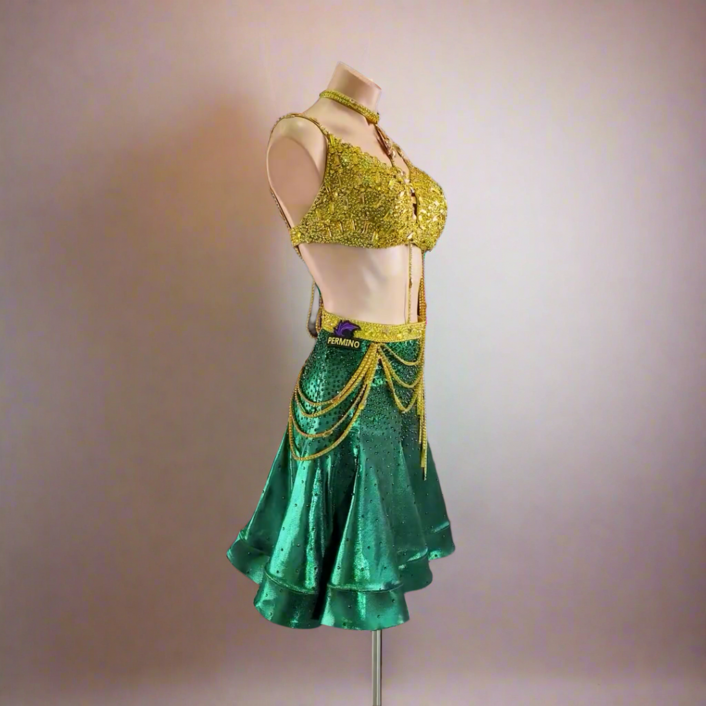 Dominate the dance floor in this magnificent gold and green latin dress that guarantees spotlight attention. The luxuriously stoned gold bodice transitions beautifully into a vibrant metallic green skirt enhanced with gleaming gold details. Crafted specifically for competitive performance, the Verdant Spark masterfully combines sophisticated elegance with dazzling brilliance and fluid movement that will elevate your routine to championship level.