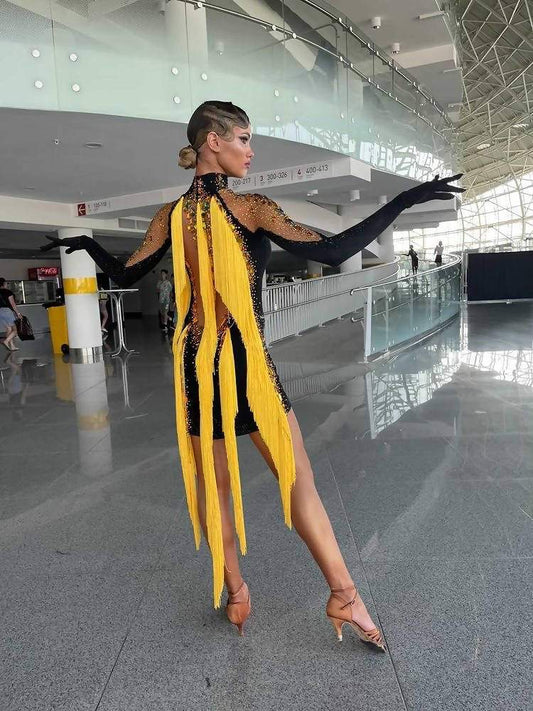 Melnikoffs Black Latin Dress with Yellow Fringe