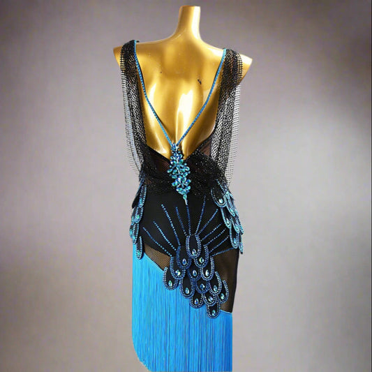 Blue Latin Dress with Lace and Fringe