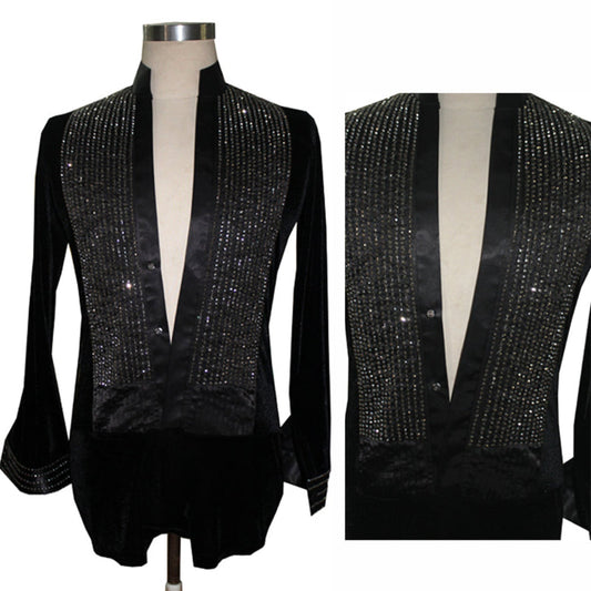 Customized Black Velvet Latin Shirt with Rhinestones | p13
