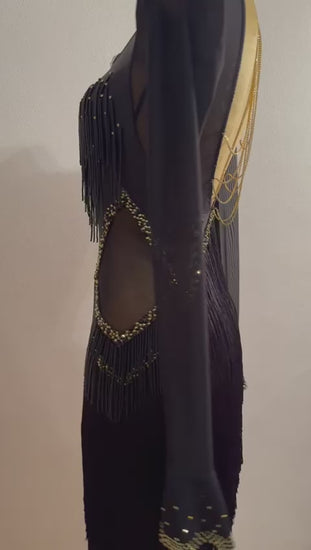- Black, Swarovski crystals, fringe, beads, professional, amateur, youth, long sleeve dress for sale
