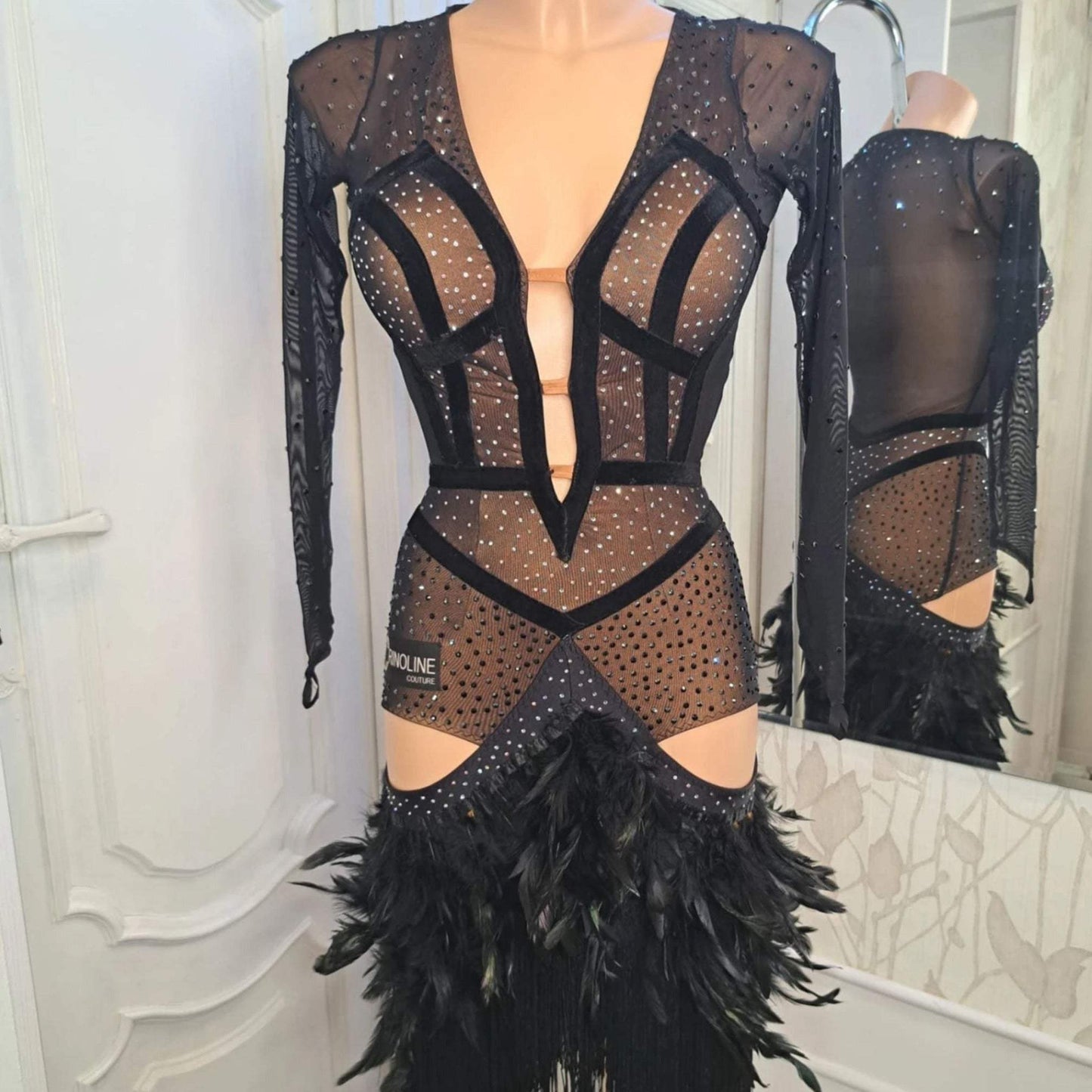 - Black, mesh, fringe, feathers, crystals, professional, amateur, youth, long sleeve dress