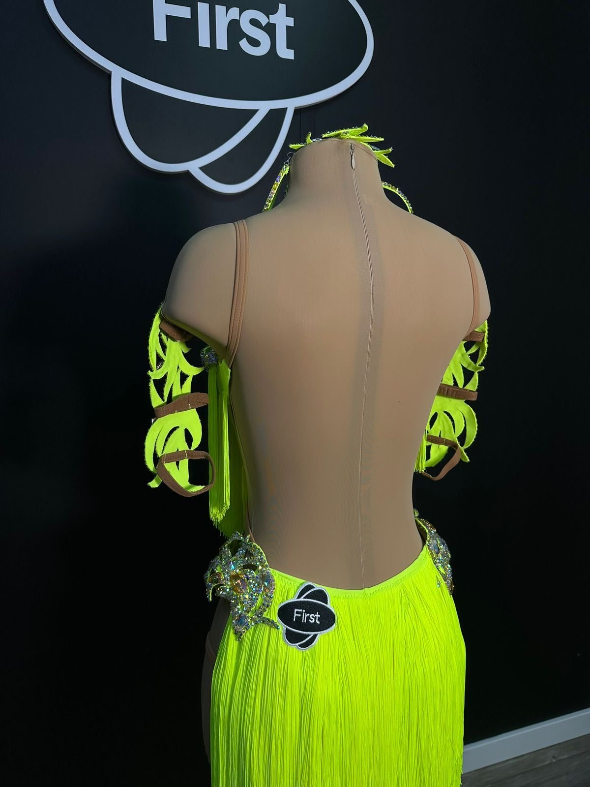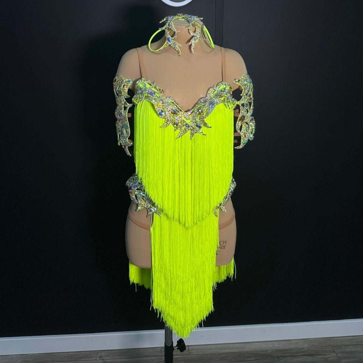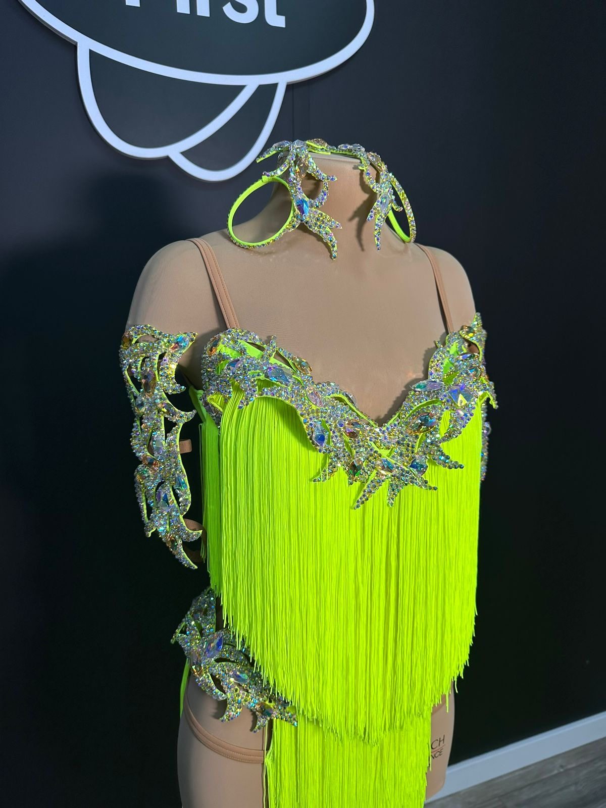 - Green, rhinestones, fringe, professional, amateur, youth, sleeveless dress for sale