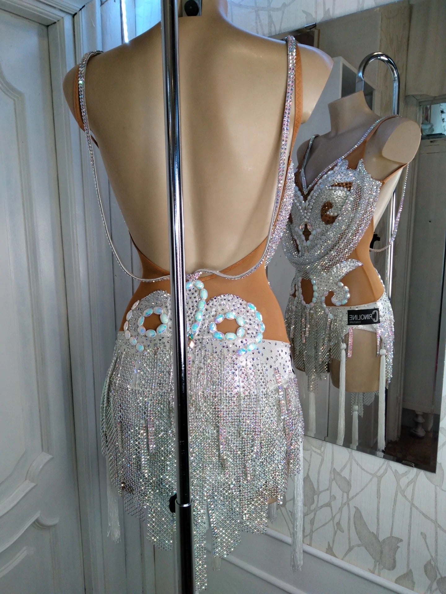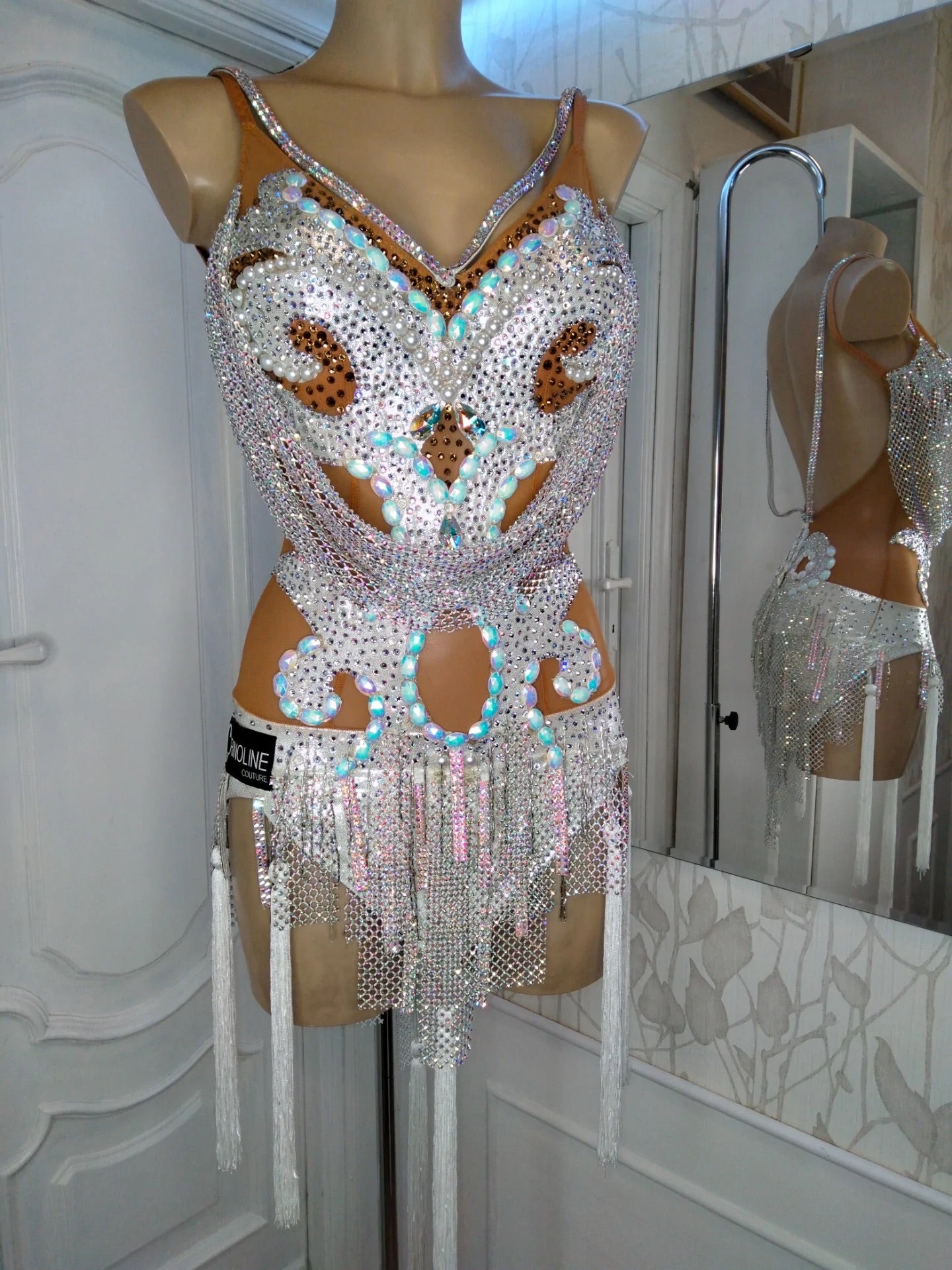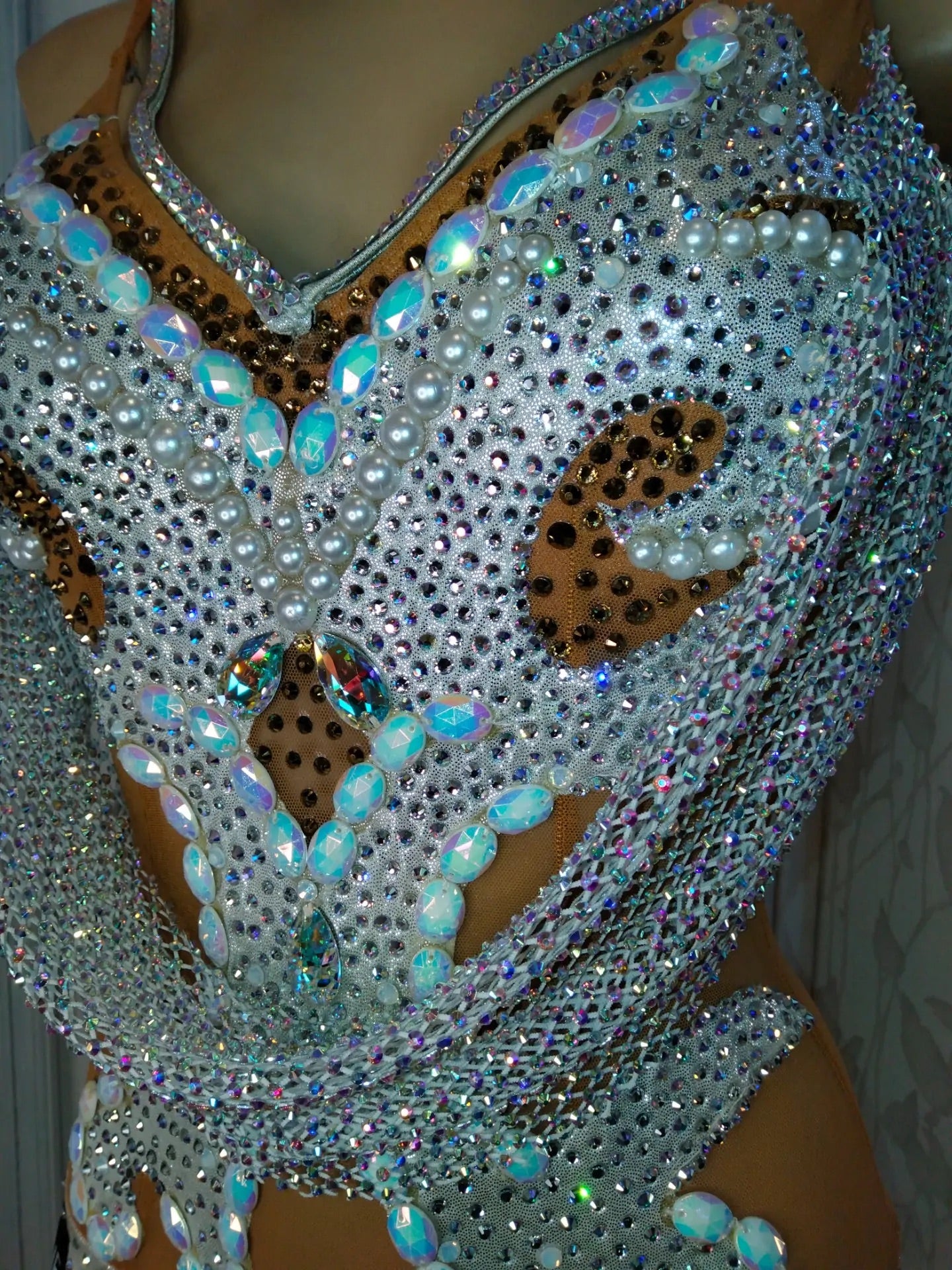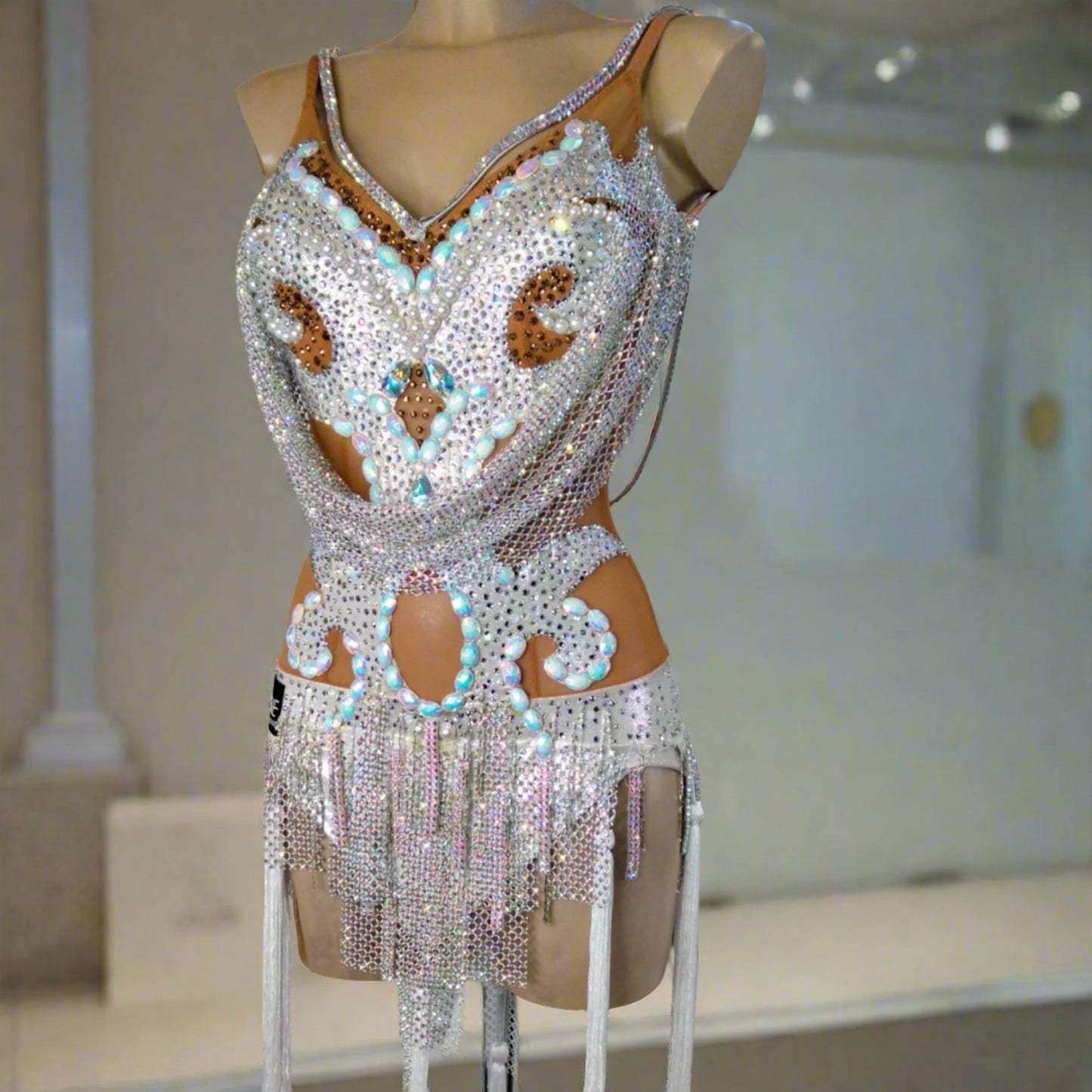 Experience the glamour of our sleeveless dress in stunning white and silver. Constructed from coated lycra and flesh-colored net, this dazzling dress boasts rhinestone mesh, tinsel, and a mixture of crystal, crystal AB rhinestones, stones, and pearls. Ideal for creating a bold statement with graceful movements on the dance floor.