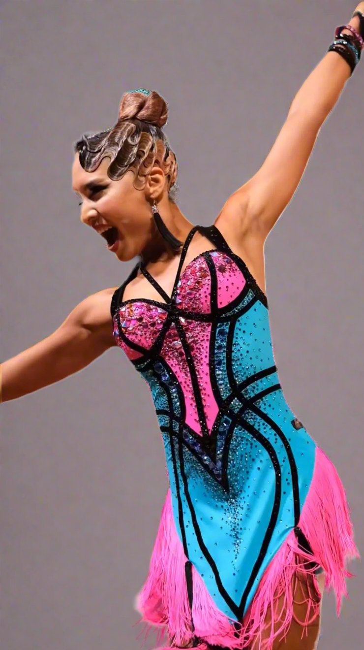 Dazzle in this vibrant new latin dance dress, adorned with bold blue and pink crystals. The captivating design features a rich pink and blue bodice, with striking black lines enhancing the silhouette, and dynamic layers of pink and black fringes, bringing movement and energy to every step. Ideal for competitions, this bespoke creation promises to make you stand out with its brilliant sparkle and flawless fit.