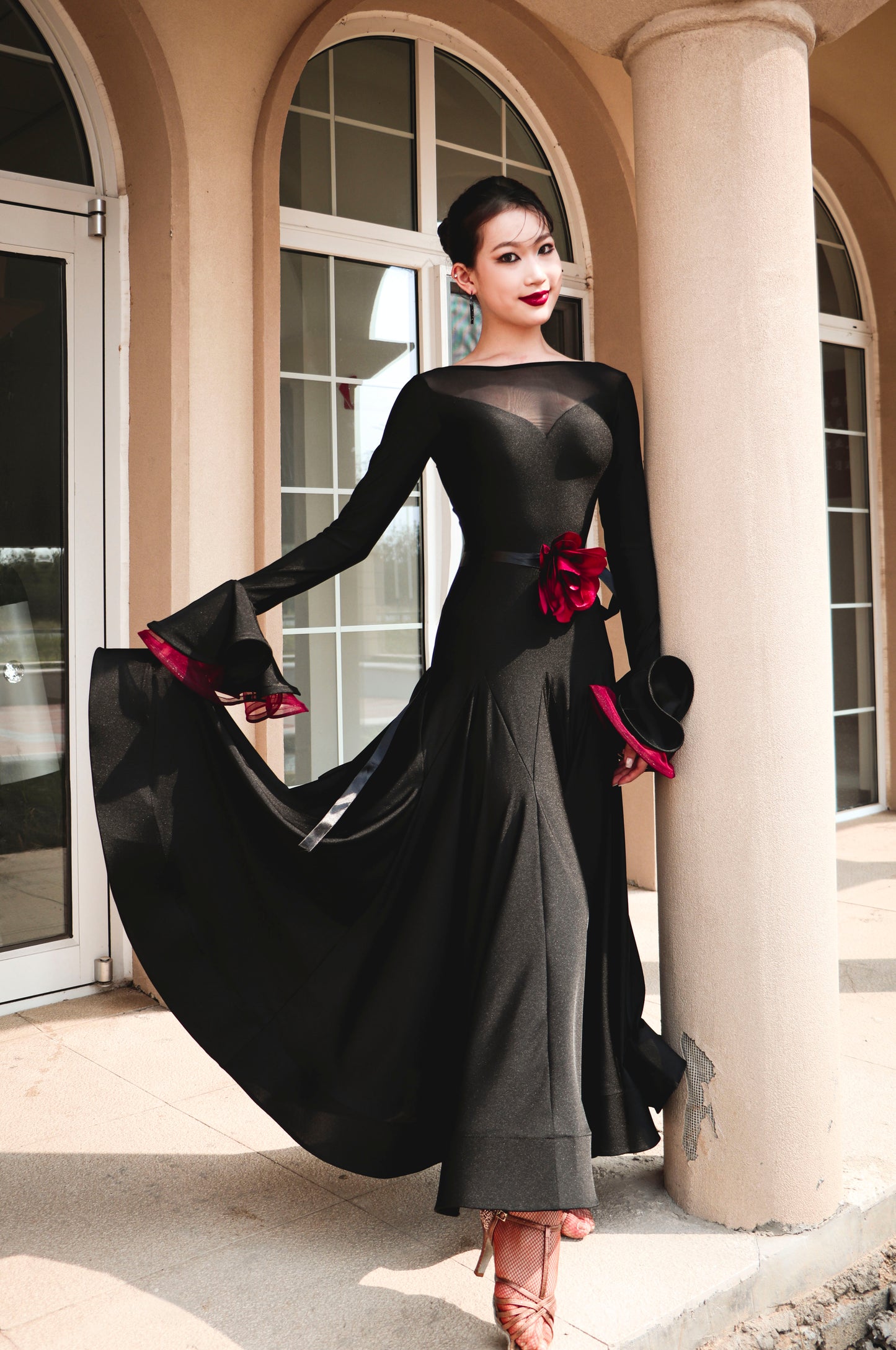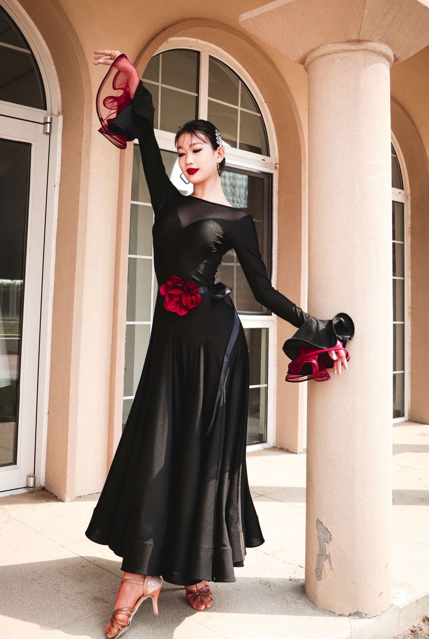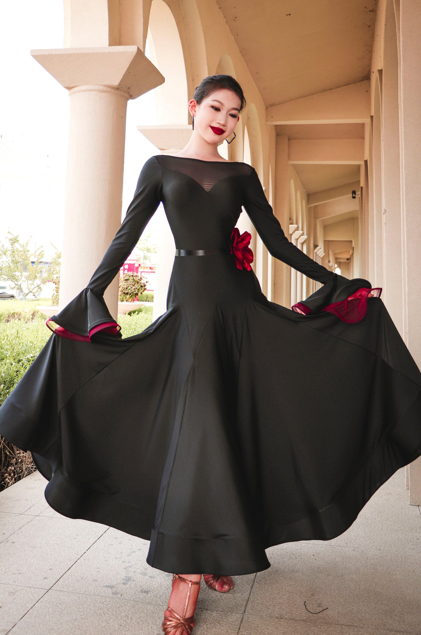 Discover elegance in motion with our new long sleeve ballroom practice dress, available in two stunning options: black with red accents and red with black accents. Adorned with crinoline detailing for enhanced fluidity, this dress is designed for comfort and style, making it the perfect choice for dancers who seek a sophisticated practice ensemble.