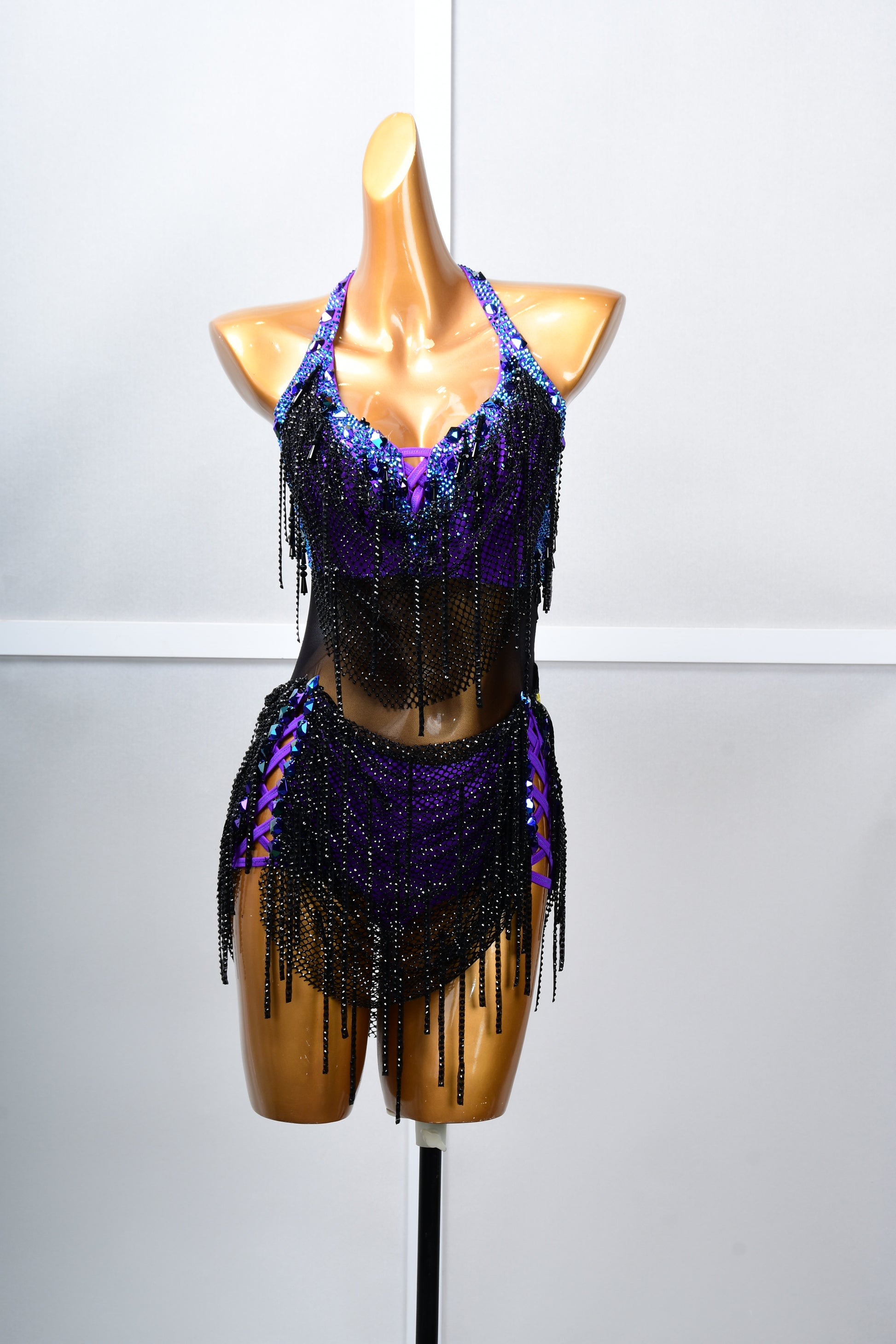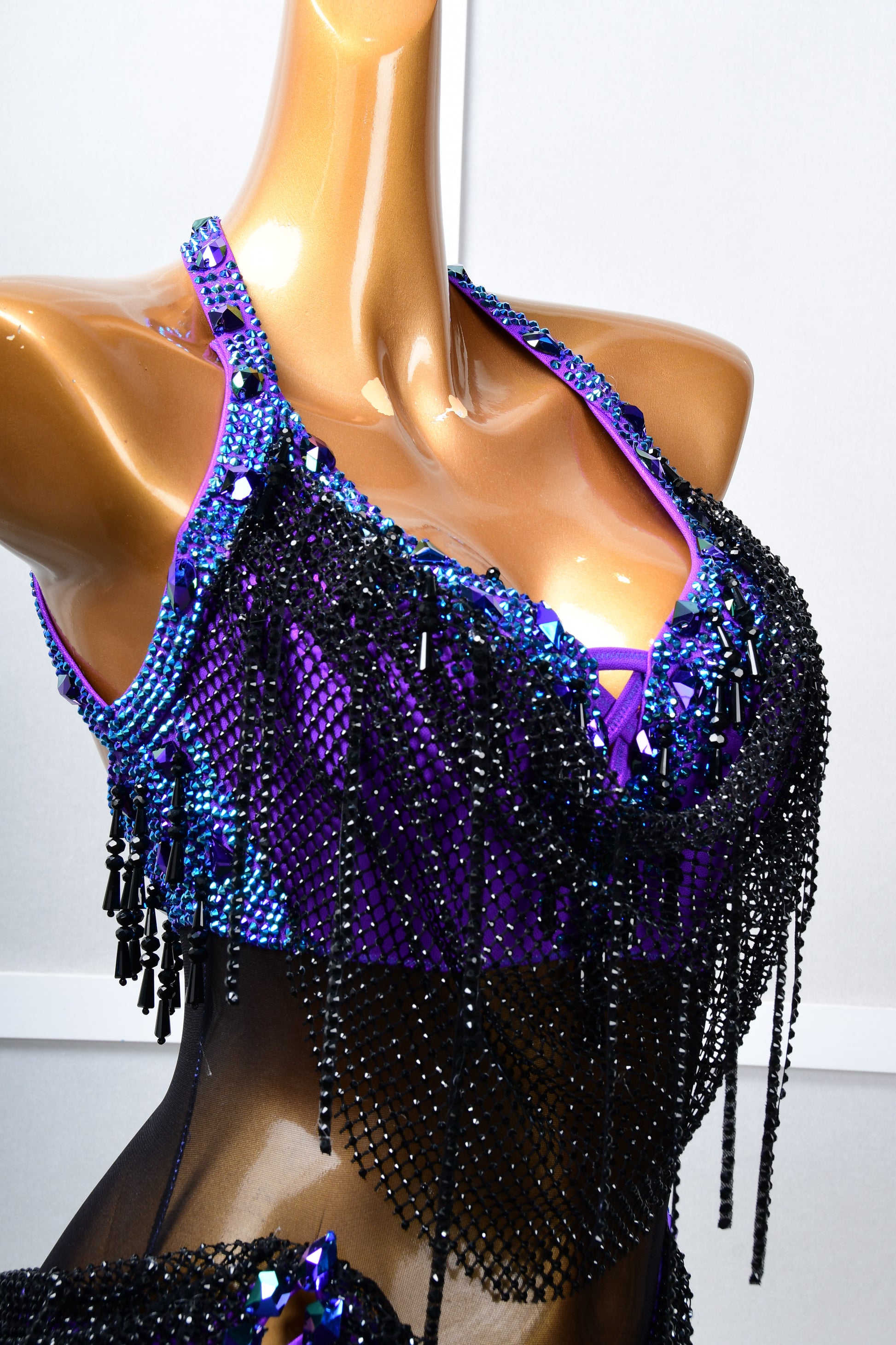 Step into the spotlight with this striking purple and black latin dress, featuring sparkling crystals, daring mesh inserts and stylish side lace-up accents. Designed to captivate and flow effortlessly with your every move, this dress is your perfect partner for a fierce and flirtatious performance.