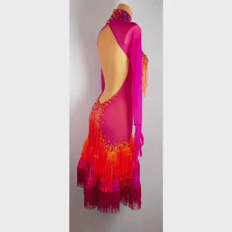 Transform into the center of attention with this breathtaking hot pink latin dance dress by LUK Design! Embellished with fiery orange and golden accents, dazzling beads, pearls, and playful tassels, this long-sleeve ballroom gown gracefully glides with your every move.