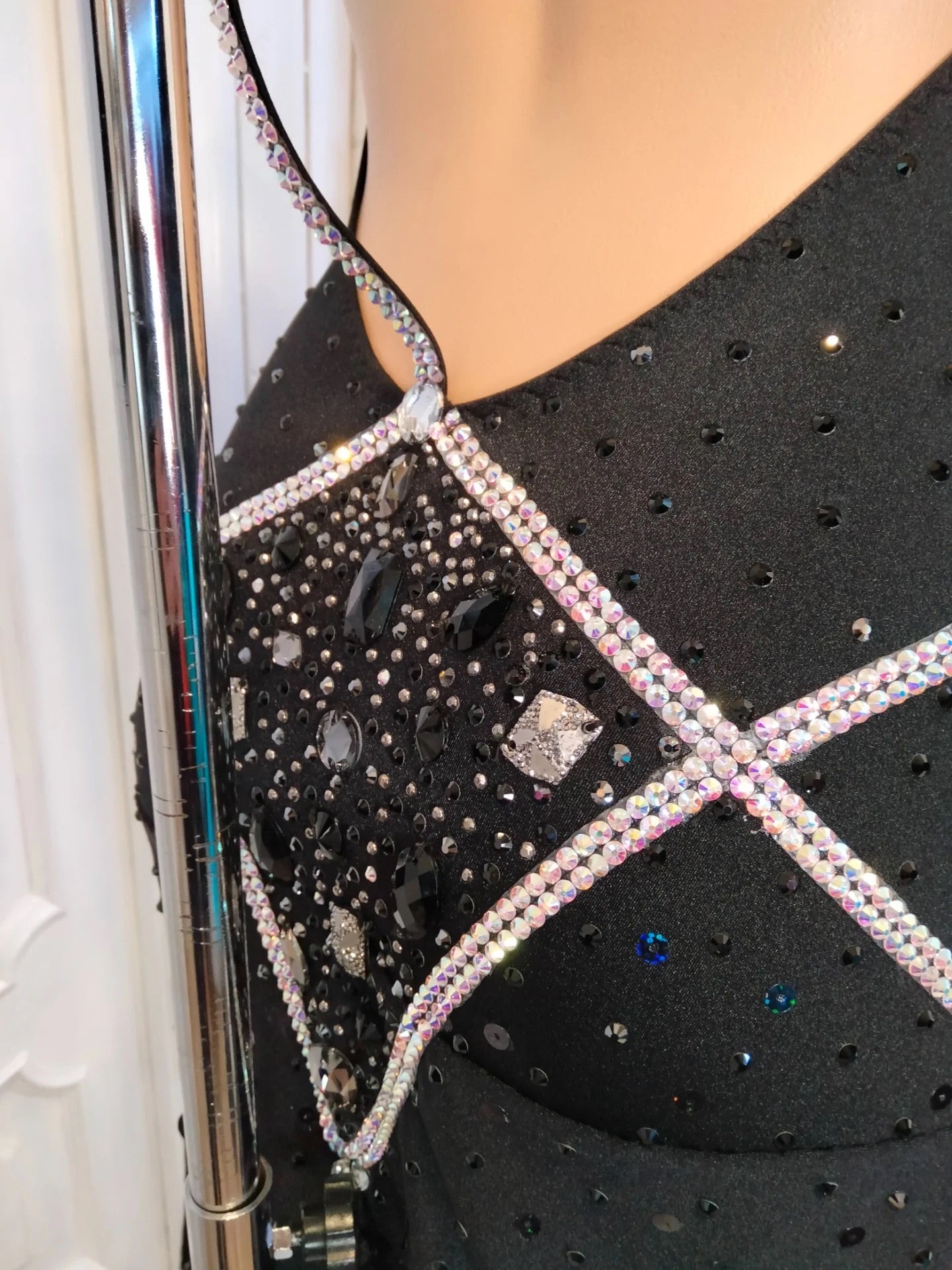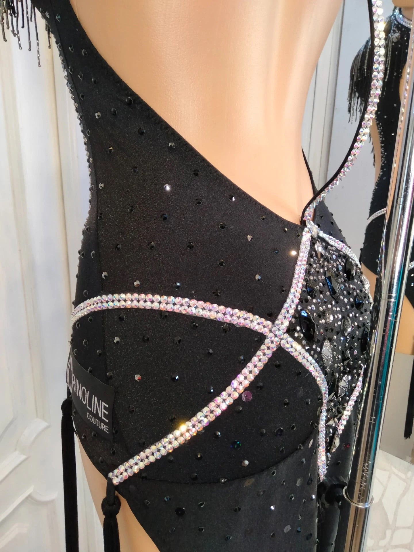 Experience the new level of elegance with our sleeveless black latin dance dress. Crafted from luxurious lycra, and embellished with a dazzling array of rhinestones in crystal, crystal AB, jet, and jet hematite, this dress is adorned with fringes and tinsel to add extra sparkle and fluidity. For dancers who crave the spotlight, this dress is sure to make you dazzle on the dance floor.