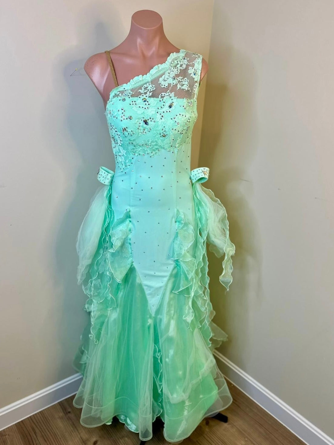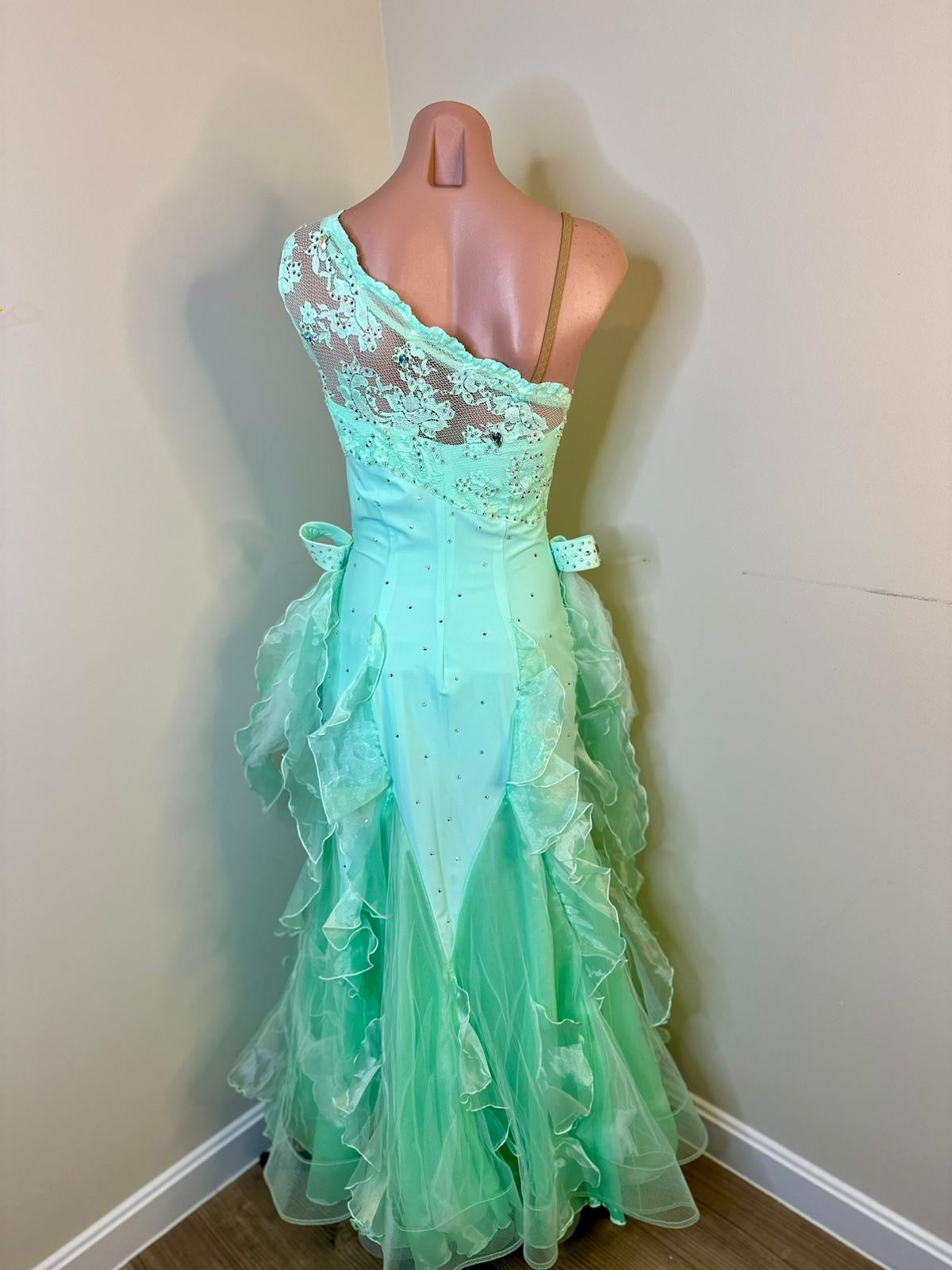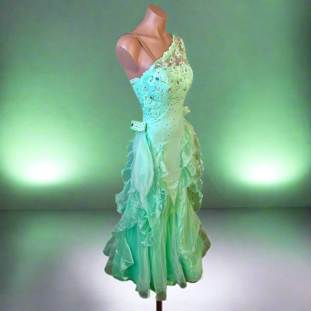 Dance with enchanting grace in this exquisite mint ballroom dress.