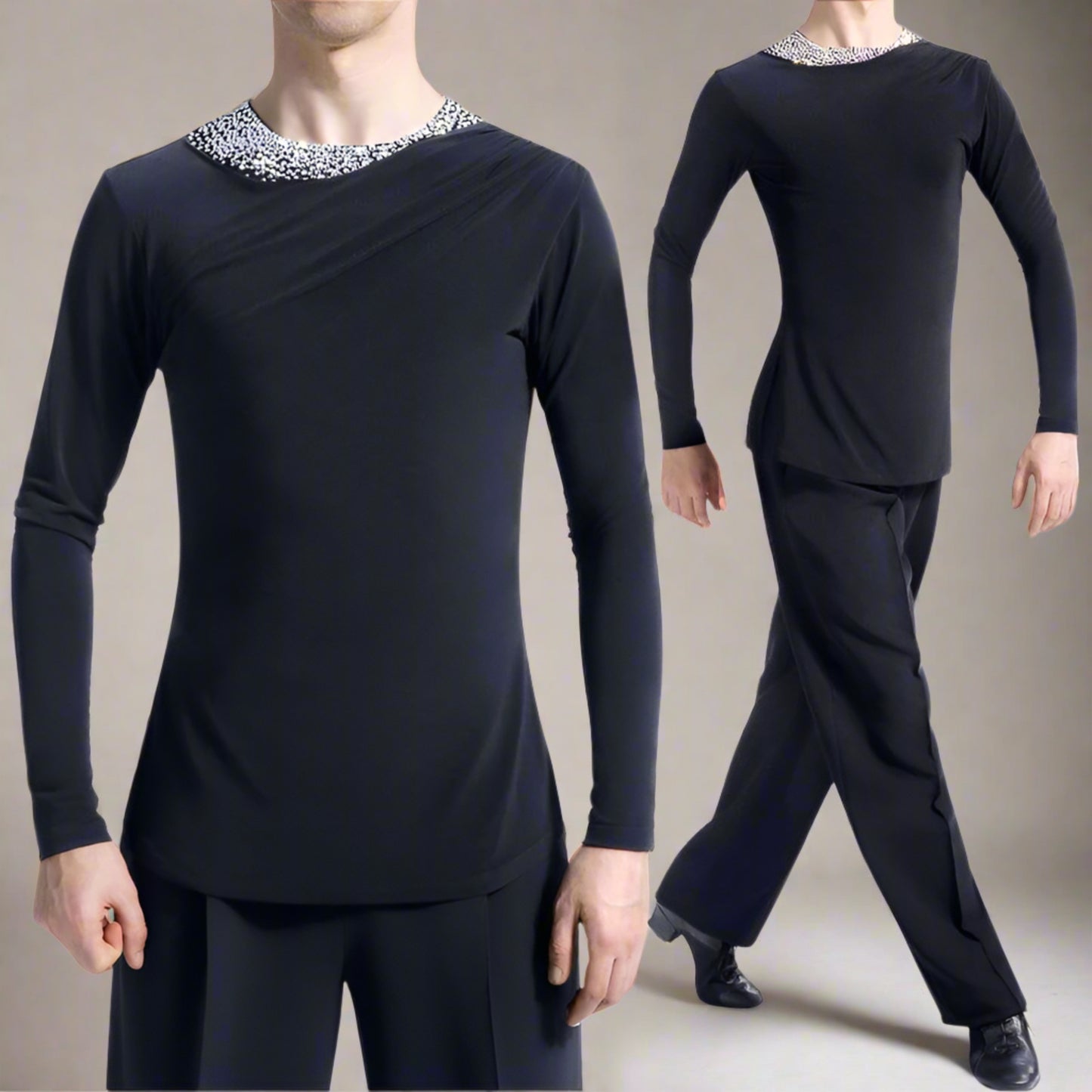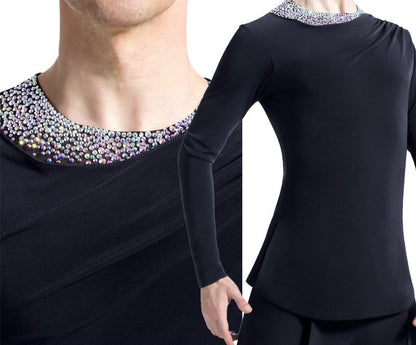 Dazzle in the spotlight with this black men's latin dance shirt! Its long sleeves and stunning stone embellishments around the neckline make it perfect for latin and salsa competitions. This customizable-size shirt offers a sleek and flexible fit for elegance and performance on the dance floor.