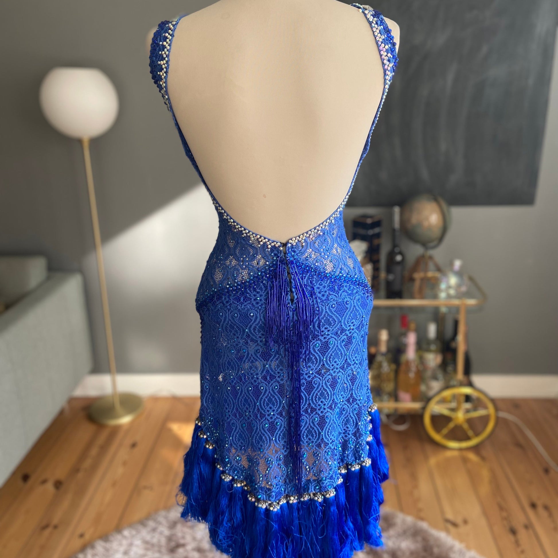 - Blue, lace, fringe, beads, crystals, professional, amateur, youth, sleeveless dress for sale