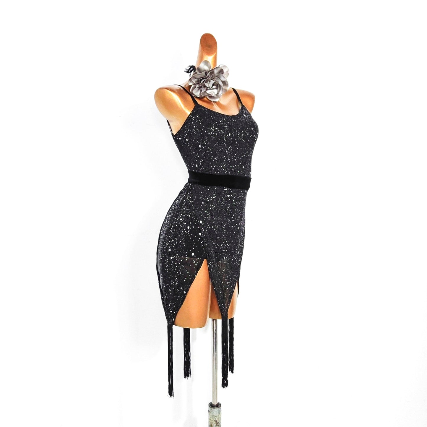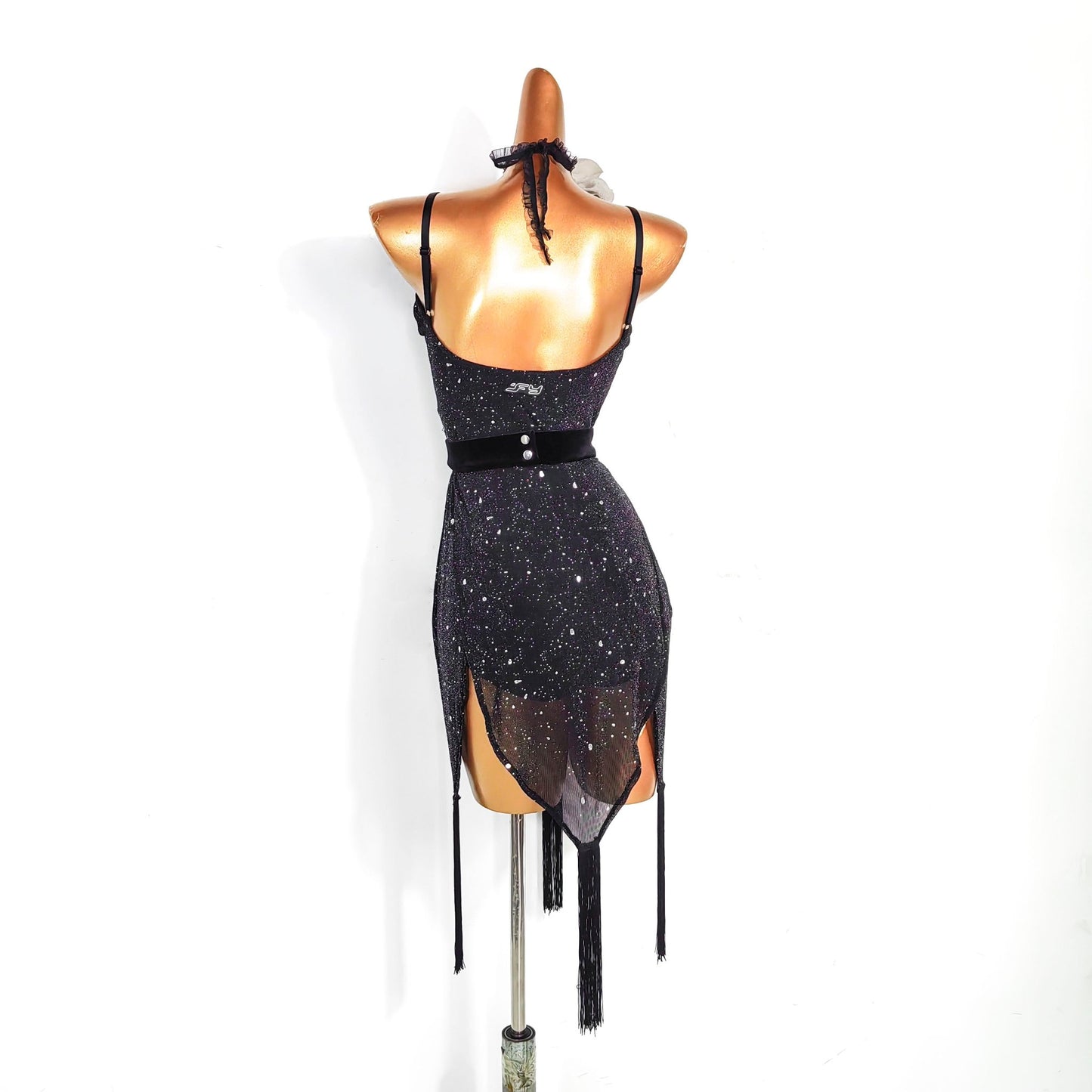 Shine on the dance floor with this new black latin practice dress. Crafted for dynamic movement, it features a sleek, shiny finish and playful fringes at the bottom. This dress is perfect for dancers seeking a blend of style, elegance, and fluidity during practice sessions. Ideal for enhancing your latin dance performance.