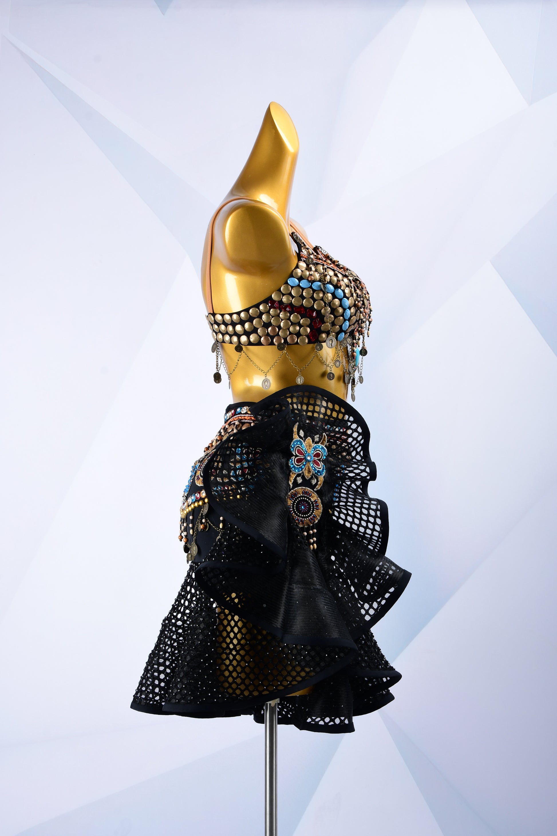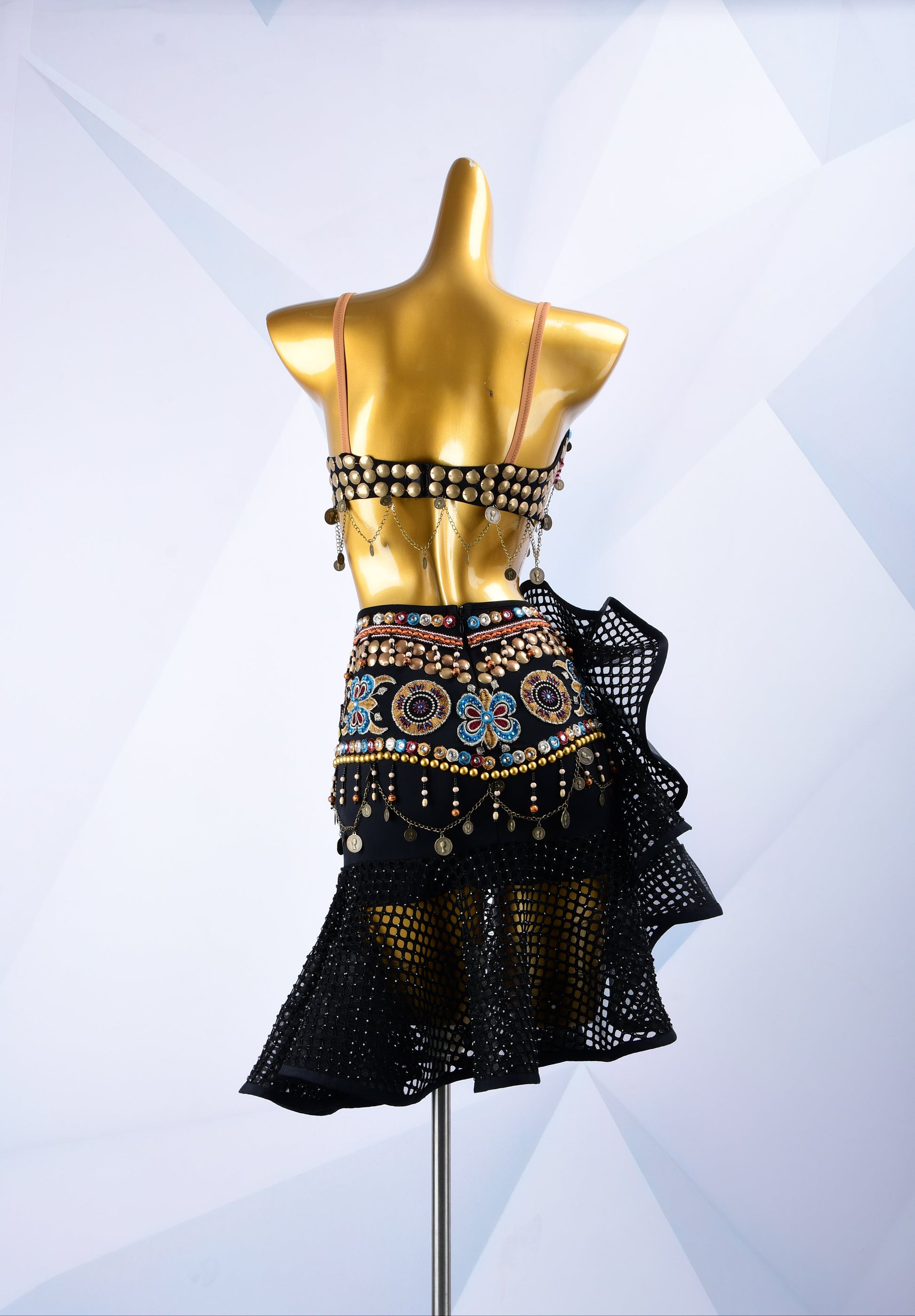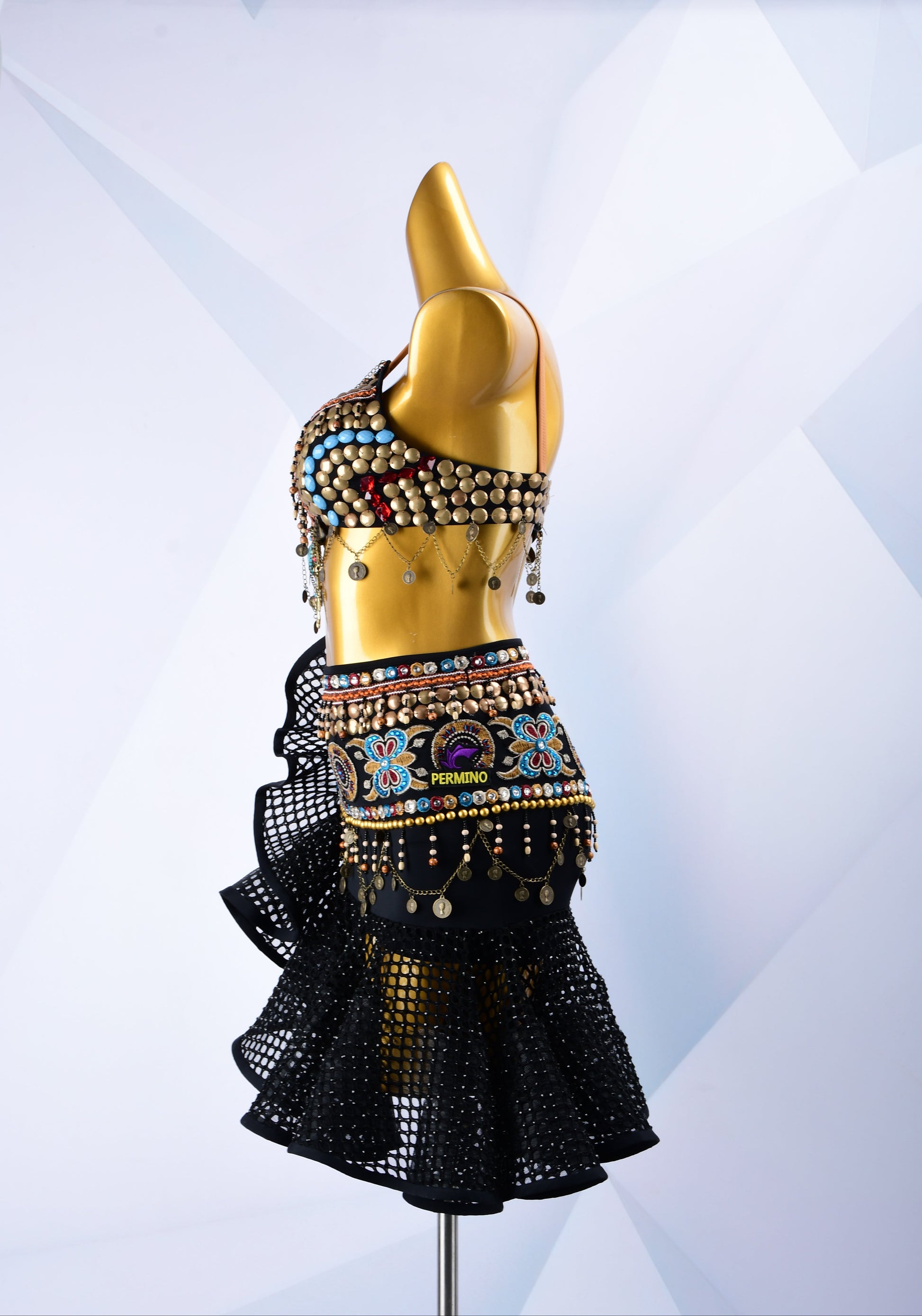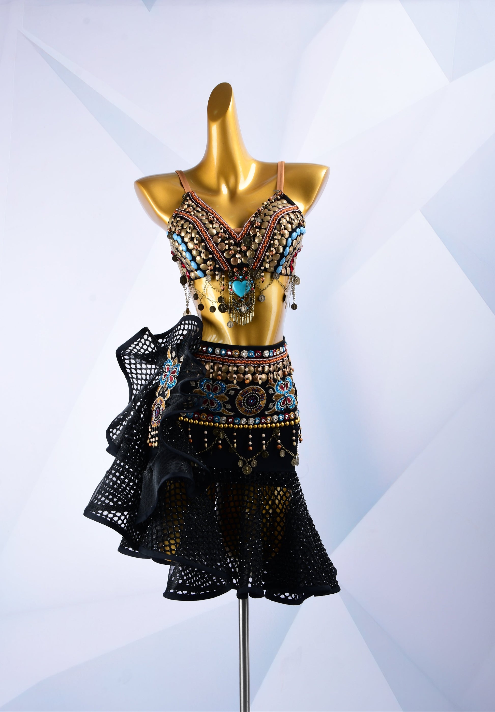Elevate your dance performance with this striking tribal-inspired set, adorned with shimmering coins, vibrant turquoise beads, intricate floral embroidery, and a flowing layered mesh skirt. Perfect for making a bold statement in latin or fusion dance styles.