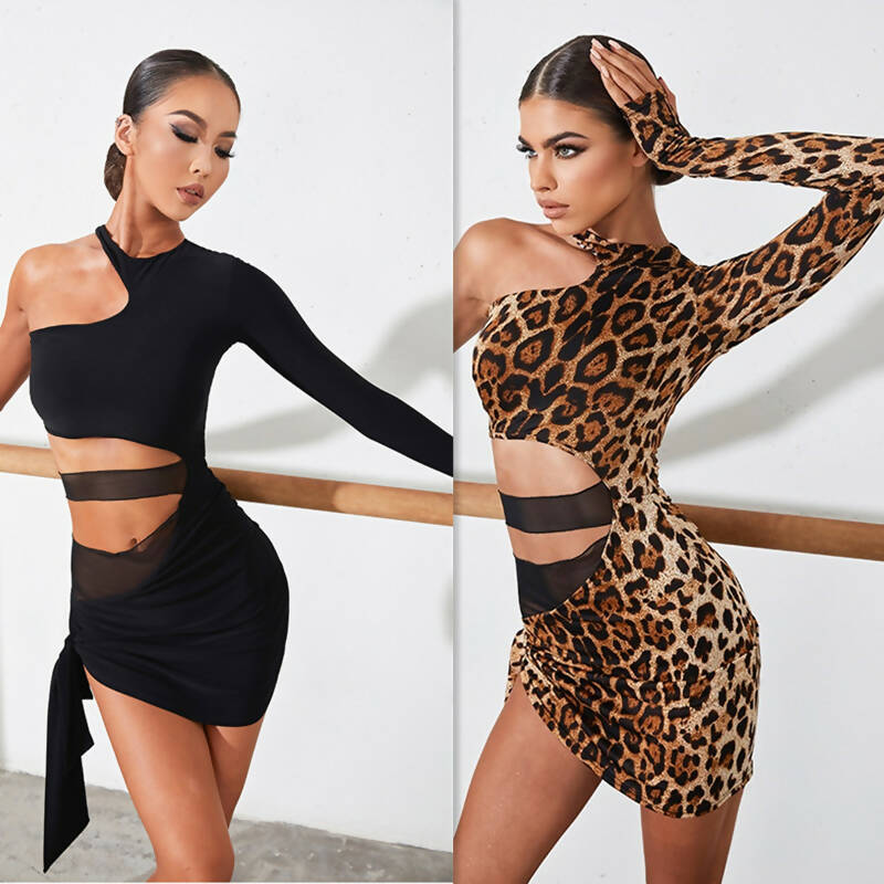 Unleash your inner confidence on the dance floor with one of these alluring one-sleeve latin practice dresses for sale. Featuring a striking waist cutout, this dress seamlessly combines sensuality with style. The daring design showcases your silhouette while maintaining an air of elegance. Available in both classic black and captivating animal print colors, this dress invites you to express your wild side with grace and poise.